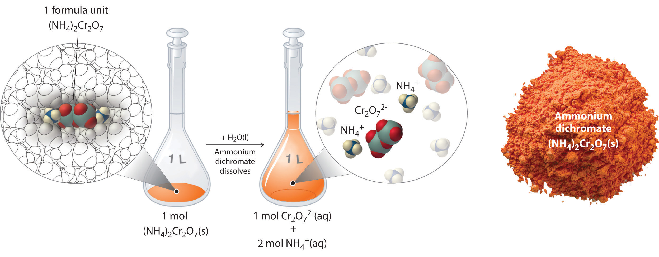 Thus 1 mol of ammonium dichromate formula units dissolves in water to produce 1 mol of Cr2O72− anions and 2 mol of NH4+ cations (see Figure 4.9 "Dissolution of 1 mol of an Ionic Compound").