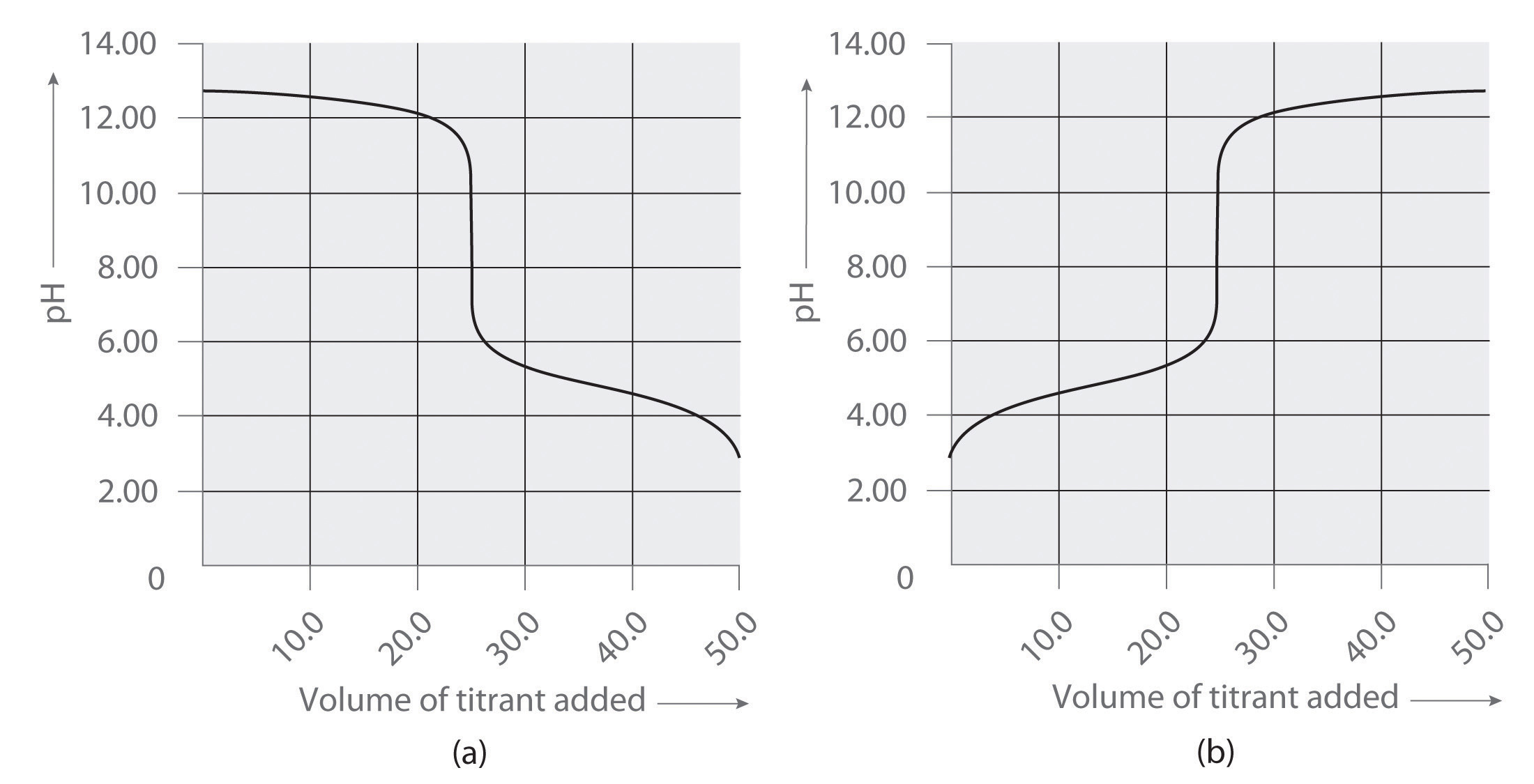 Following are two graphs that illustrate how the pH of a solution varies during a titration. One graph corresponds to the titration of 100 mL 0.10 M acetic acid with 0.10 M NaOH, and the other corresponds to the titration of 100 mL 0.10 M NaOH with 0.10 M acetic acid. Which graph corresponds to which titration? Justify your answer.