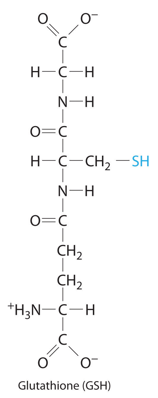Glutathione is a low-molecular-weight compound found in living cells that is produced naturally by the liver. Health-care providers give glutathione intravenously to prevent side effects of chemotherapy and to prevent kidney problems after heart bypass surgery. Its structure is as follows: