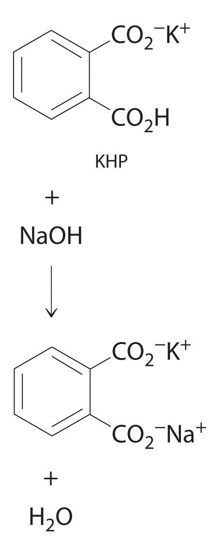 In Example 20, the concentration of the titrant (I2) was accurately known. The accuracy of any titration analysis depends on an accurate knowledge of the concentration of the titrant. Most titrants are first standardized; that is, their concentration is measured by titration with a standard solutionA solution whose concentration is precisely known., which is a solution whose concentration is known precisely. Only pure crystalline compounds that do not react with water or carbon dioxide are suitable for use in preparing a standard solution. One such compound is potassium hydrogen phthalate (KHP), a weak monoprotic acid suitable for standardizing solutions of bases such as sodium hydroxide. The reaction of KHP with NaOH is a simple acid–base reaction. If the concentration of the KHP solution is known accurately and the titration of a NaOH solution with the KHP solution is carried out carefully, then the concentration of the NaOH solution can be calculated precisely. The standardized NaOH solution can then be used to titrate a solution of an acid whose concentration is unknown.