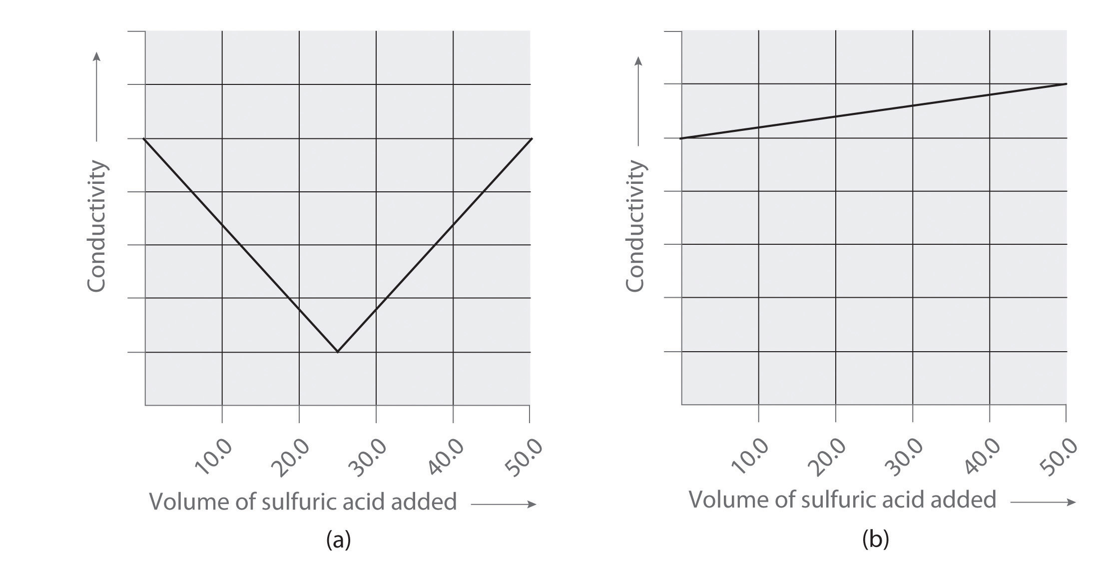 Following are two graphs that illustrate how the electrical conductivity of a solution varies during a titration. One graph corresponds to the titration of 100 mL 0.10 M Ba(OH)2 with 0.10 M H2SO4 , and the other corresponds to the titration of 100 mL of 0.10 M NaOH with 0.10 M H2SO4. Which graph corresponds to which titration? Justify your answer.