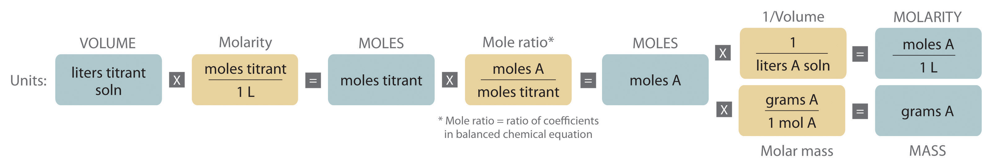 The chemical nature of the species present in the unknown dictates which type of reaction is most appropriate and also how to determine the equivalence point. The volume of titrant added, its concentration, and the coefficients from the balanced chemical equation for the reaction allow us to calculate the total number of moles of the unknown in the original solution. Because we have measured the volume of the solution that contains the unknown, we can calculate the molarity of the unknown substance. This procedure is summarized graphically here: