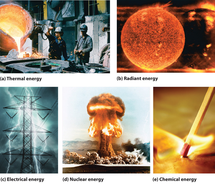 The forms of energy include thermal energy, radiant energy, electrical energy, nuclear energy, and chemical energy (Figure 5.1 "Forms of Energy"). Thermal energyEnergy that results from atomic and molecular motion; the faster the motion, the higher the thermal energy. results from atomic and molecular motion; the faster the motion, the greater the thermal energy. The temperatureA measure of an object’s thermal energy content. of an object is a measure of its thermal energy content. Radiant energyOne of the five forms of energy, radiant energy is carried by light, microwaves, and radio waves (the other forms of energy are thermal, chemical, nuclear, and electrical). Objects left in bright sunshine or exposed to microwaves become warm because much of the radiant energy they absorb is converted to thermal energy. is the energy carried by light, microwaves, and radio waves. Objects left in bright sunshine or exposed to microwaves become warm because much of the radiant energy they absorb is converted to thermal energy. Electrical energyOne of the five forms of energy, electrical energy results from the flow of electrically charged particles. The other four forms of energy are radiant, thermal, chemical, and nuclear. results from the flow of electrically charged particles. When the ground and a cloud develop a separation of charge, for example, the resulting flow of electrons from one to the other produces lightning, a natural form of electrical energy. Nuclear energyOne of the five forms of energy, nuclear energy is stored in the nucleus of an atom. The other four forms of energy are radiant, thermal, chemical, and electrical. is stored in the nucleus of an atom, and chemical energyOne of the five forms of energy, chemical energy is stored within a chemical compound because of a particular arrangement of atoms. The other four forms of energy are radiant, thermal, nuclear, and electrical. is stored within a chemical compound because of a particular arrangement of atoms.