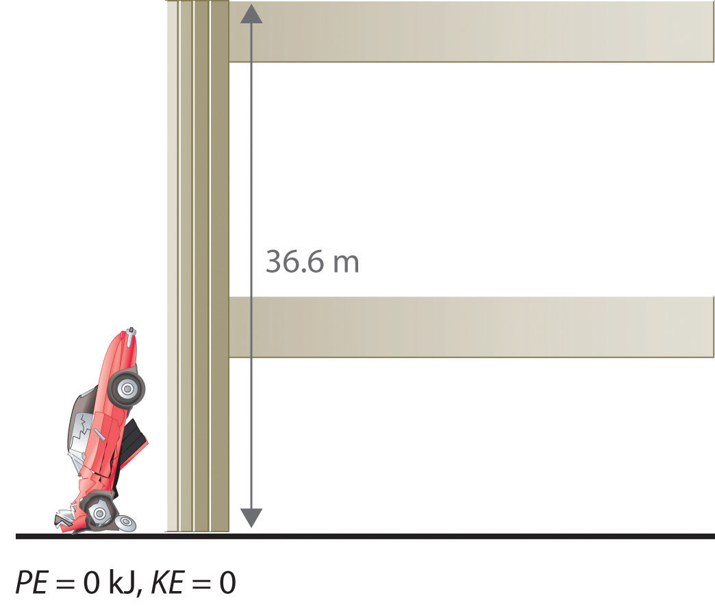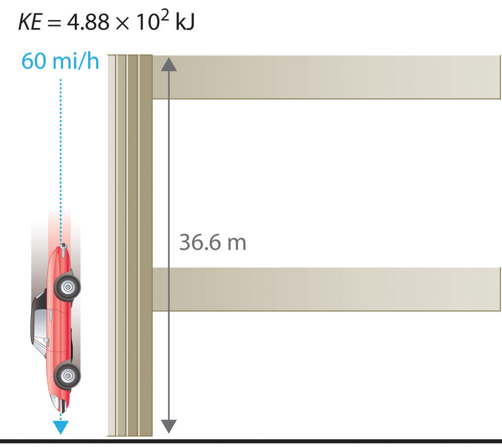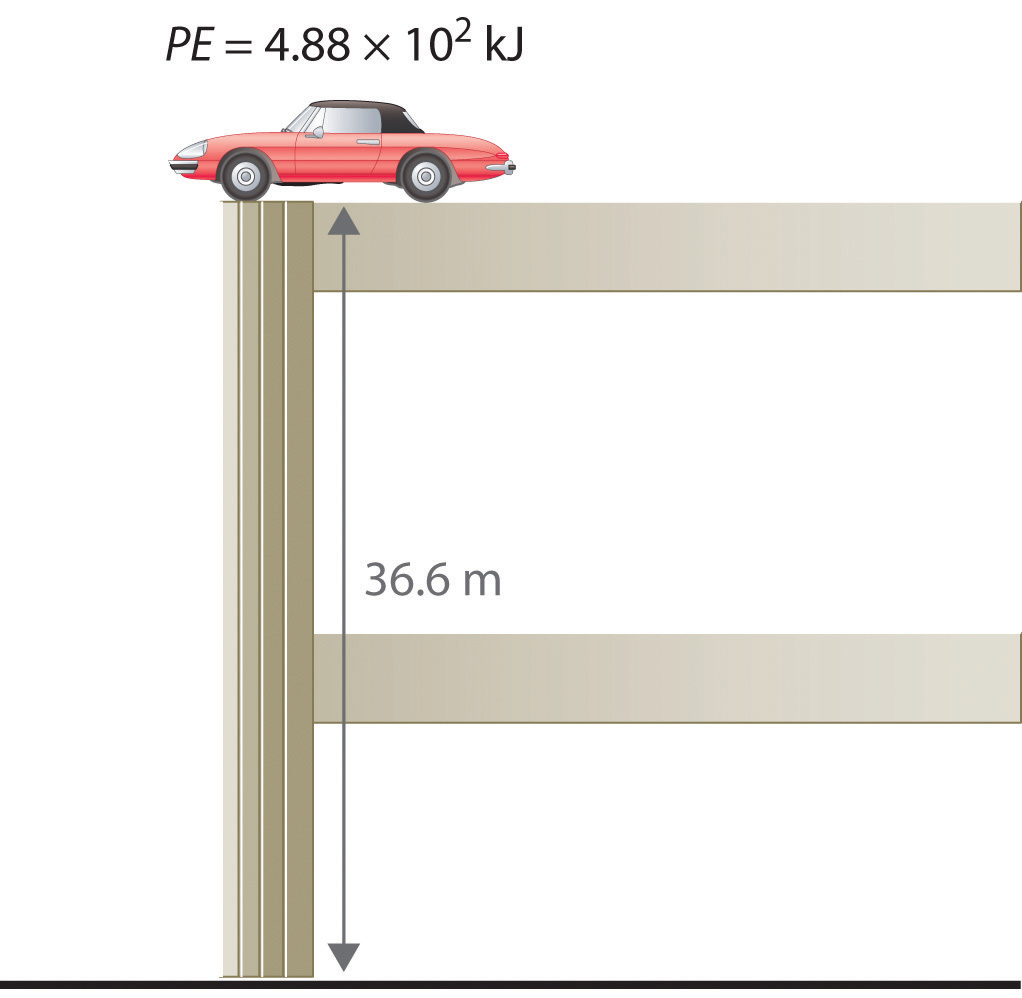 The units of potential energy are the same as the units of kinetic energy. Notice that in this case the potential energy of the stationary automobile at the top of a 36.6 m high parking garage is the same as its kinetic energy at 60 mi/h. If the vehicle fell from the roof of the parking garage, its potential energy would be converted to kinetic energy, and it is reasonable to infer that the vehicle would be traveling at 60 mi/h just before it hit the ground, neglecting air resistance. After the car hit the ground, its potential and kinetic energy would both be zero.