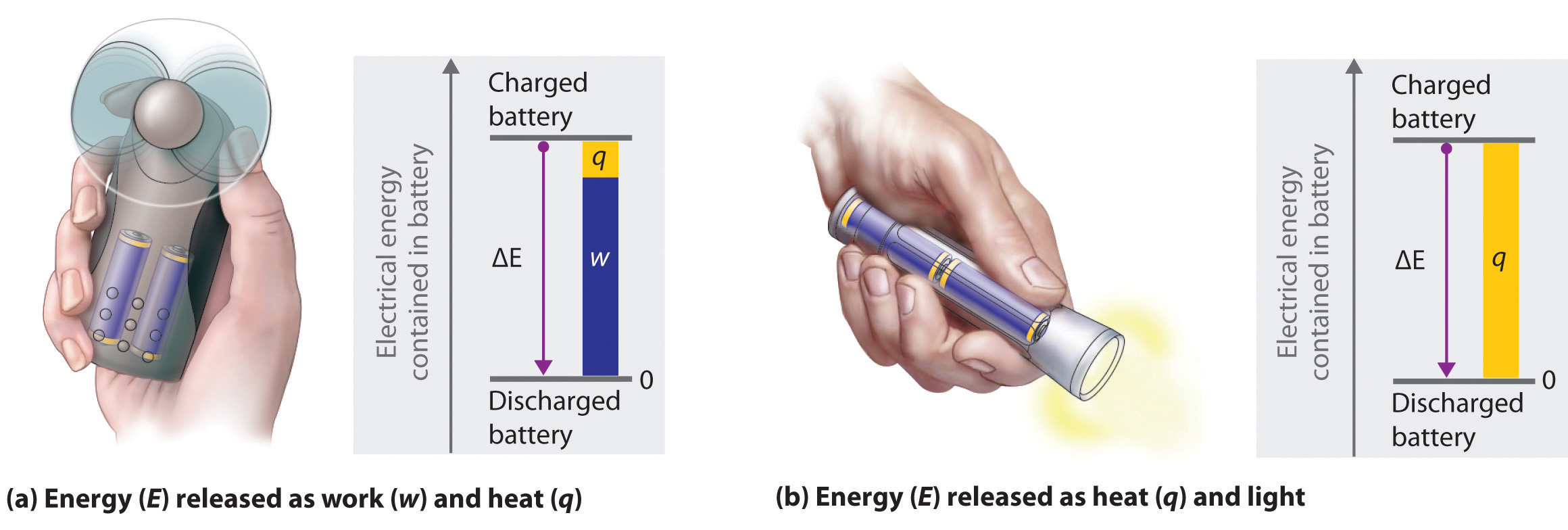 The energy of an object can be changed only by the transfer of energy to or from another object in the form of heat,As you will learn in Chapter 6 "The Structure of Atoms", hot objects can also lose energy as radiant energy, such as heat or light. This energy is converted to heat when it is absorbed by another object. Hence radiant energy is equivalent to heat. work performed on or by the object, or some combination of heat and work. Consider, for example, the energy stored in a fully charged battery. As shown in Figure 5.4 "Energy Transfer", this energy can be used primarily to perform work (e.g., running an electric fan) or to generate light and heat (e.g., illuminating a light bulb). When the battery is fully discharged in either case, the total change in energy is the same, even though the fraction released as work or heat varies greatly. The sum of the heat produced and the work performed equals the change in energy (ΔE):