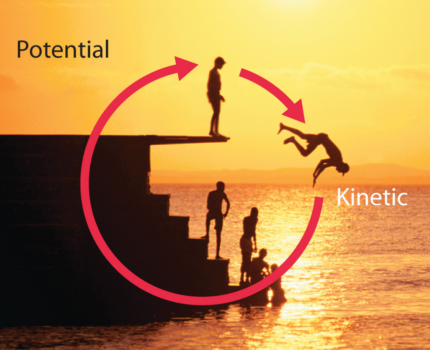 Energy can be converted from one form to another (Figure 5.2 "Interconversion of Forms of Energy") or, as we saw with the brick, transferred from one object to another. For example, when you climb a ladder to a high diving board, your body uses chemical energy produced by the combustion of organic molecules. As you climb, the chemical energy is converted to mechanical work to overcome the force of gravity. When you stand on the end of the diving board, your potential energy is greater than it was before you climbed the ladder: the greater the distance from the water, the greater the potential energy. When you then dive into the water, your potential energy is converted to kinetic energy as you fall, and when you hit the surface, some of that energy is transferred to the water, causing it to splash into the air. Chemical energy can also be converted to radiant energy; one common example is the light emitted by fireflies, which is produced from a chemical reaction.