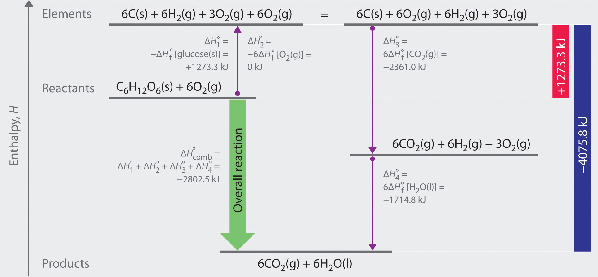 Enthalpy is a state function used to measure the heat transferred from a system to its surroundings or vice versa at constant pressure. Only the change in enthalpy (ΔH) can be measured. A negative ΔH means that heat flows from a system to its surroundings; a positive ΔH means that heat flows into a system from its surroundings. For a chemical reaction, the enthalpy of reaction (ΔHrxn) is the difference in enthalpy between products and reactants; the units of ΔHrxn are kilojoules per mole. Reversing a chemical reaction reverses the sign of ΔHrxn. The magnitude of ΔHrxn also depends on the physical state of the reactants and the products because processes such as melting solids or vaporizing liquids are also accompanied by enthalpy changes: the enthalpy of fusion (ΔHfus) and the enthalpy of vaporization (ΔHvap), respectively. The overall enthalpy change for a series of reactions is the sum of the enthalpy changes for the individual reactions, which is Hess’s law. The enthalpy of combustion (ΔHcomb) is the enthalpy change that occurs when a substance is burned in excess oxygen. The enthalpy of formation (ΔHf) is the enthalpy change that accompanies the formation of a compound from its elements. Standard enthalpies of formation () are determined under standard conditions: a pressure of 1 atm for gases and a concentration of 1 M for species in solution, with all pure substances present in their standard states (their most stable forms at 1 atm pressure and the temperature of the measurement). The standard heat of formation of any element in its most stable form is defined to be zero. The standard enthalpy of reaction () can be calculated from the sum of the standard enthalpies of formation of the products (each multiplied by its stoichiometric coefficient) minus the sum of the standard enthalpies of formation of the reactants (each multiplied by its stoichiometric coefficient)—the “products minus reactants” rule. The enthalpy of solution (ΔHsoln) is the heat released or absorbed when a specified amount of a solute dissolves in a certain quantity of solvent at constant pressure.