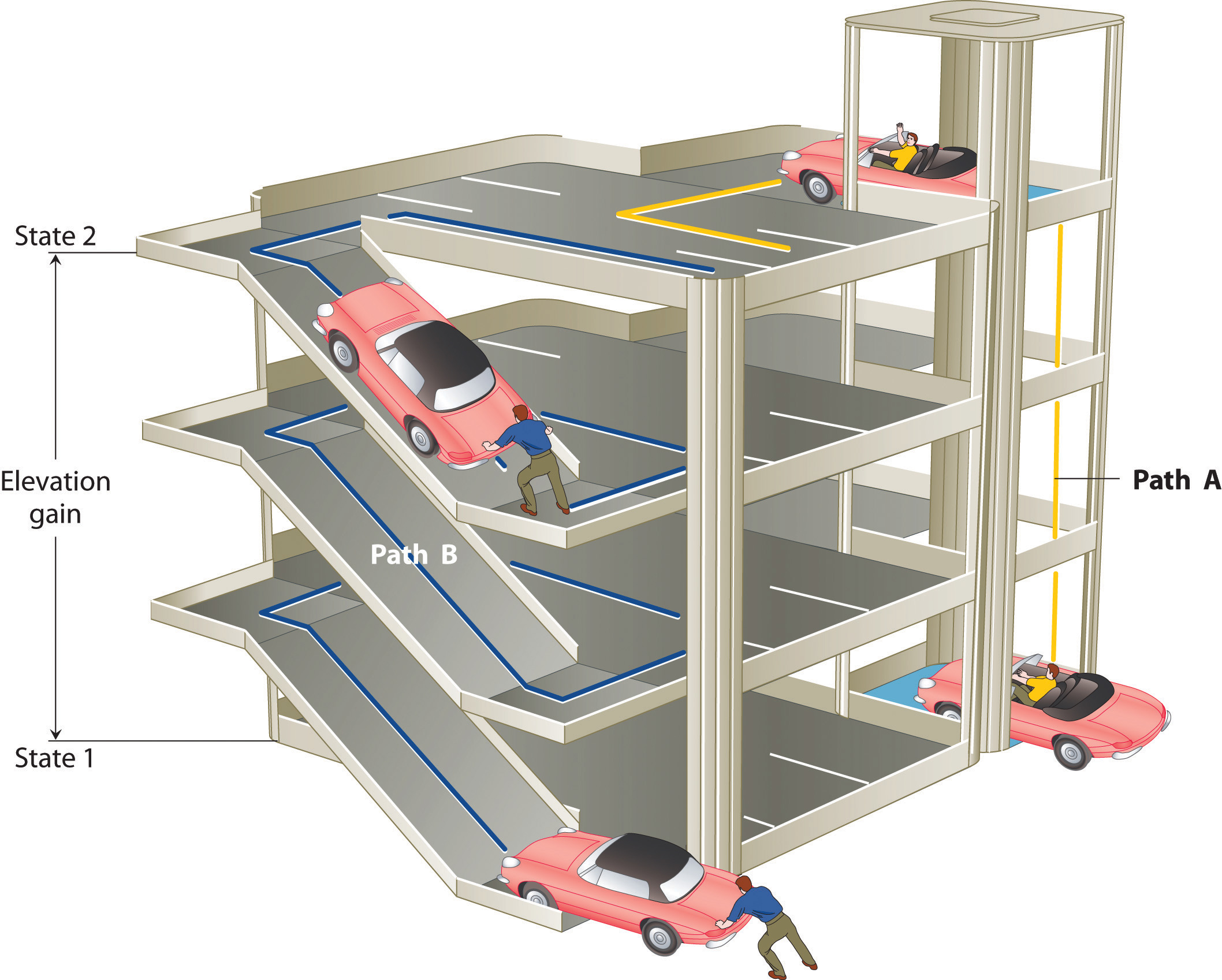 The change in elevation between state 1 (at the bottom of the parking garage) and state 2 (at the top level of the parking garage) is the same for both paths A and B; it does not depend on which path is taken from the bottom to the top. In contrast, the distance traveled and the work needed to reach the top do depend on which path is taken. Elevation is a state function, but distance and work are not state functions.