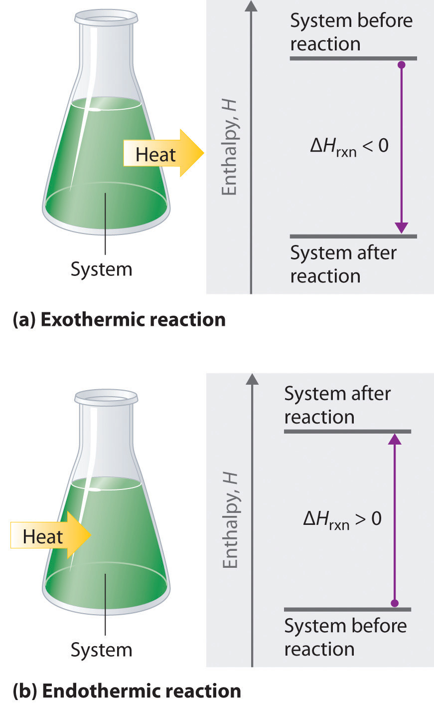 Energy changes in chemical reactions are usually measured as changes in enthalpy. (a) If heat flows from a system to its surroundings, the enthalpy of the system decreases, ΔHrxn is negative, and the reaction is exothermic; it is energetically downhill. (b) Conversely, if heat flows from the surroundings to a system, the enthalpy of the system increases, ΔHrxn is positive, and the reaction is endothermic; it is energetically uphill.