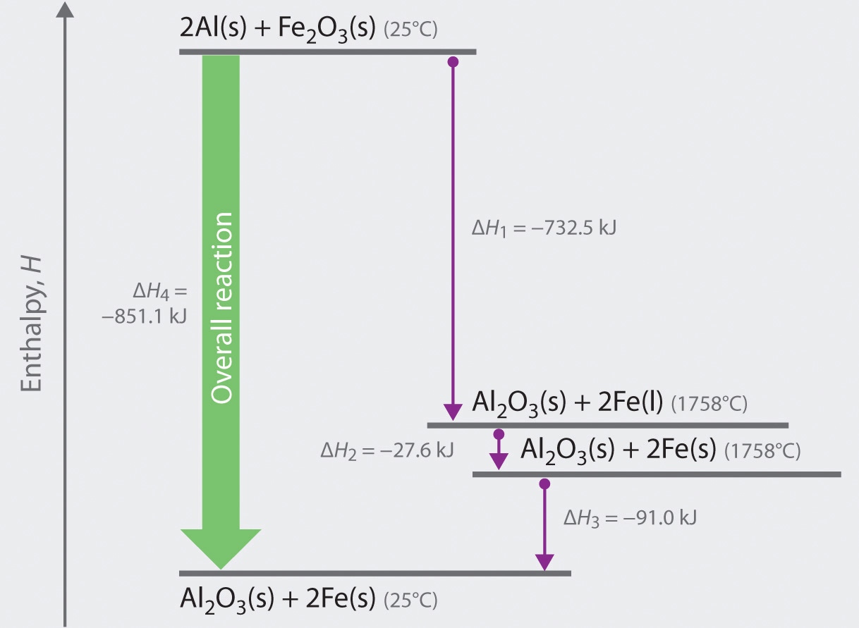 Because enthalpy is a state function, the overall enthalpy change for the reaction of 2 mol of Al(s) with 1 mol of Fe2O3(s) is −851.1 kJ, whether the reaction occurs in a single step (ΔH4, shown on the left) or in three hypothetical steps (shown on the right) that involve the successive formation of solid Al2O3 and liquid iron (ΔH1), solid iron at 1758°C (ΔH2), and solid iron at 25°C (ΔH3). Thus ΔH4 = ΔH1 + ΔH2 + ΔH3, as stated by Hess’s law.