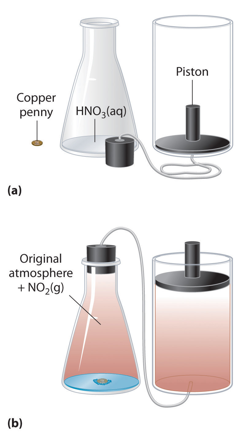 (a) Initially, the system (a copper penny and concentrated nitric acid) is at atmospheric pressure. (b) When the penny is added to the nitric acid, the volume of NO2 gas that is formed causes the piston to move upward to maintain the system at atmospheric pressure. In doing so, the system is performing work on its surroundings.