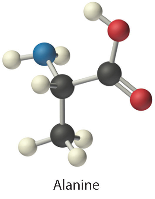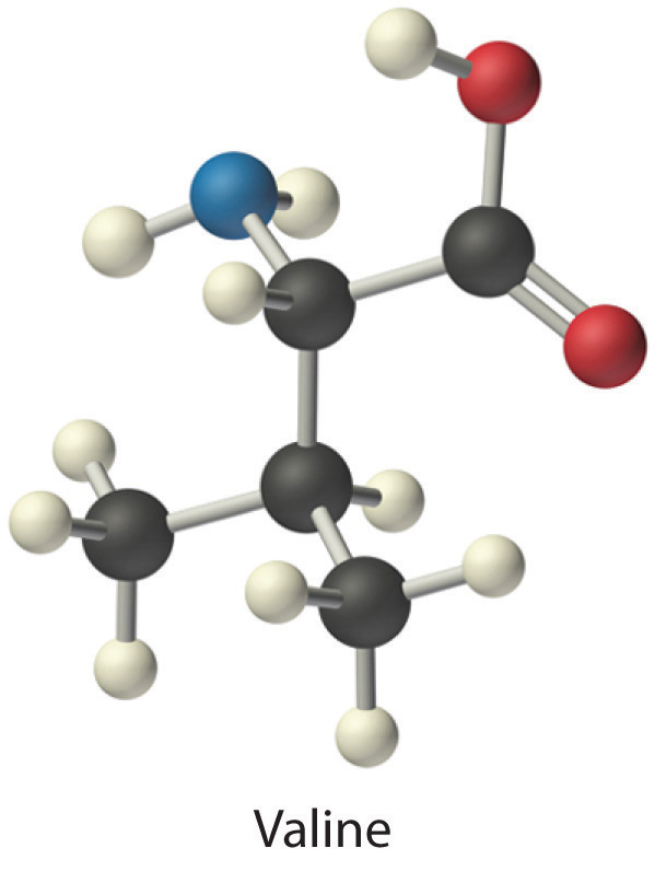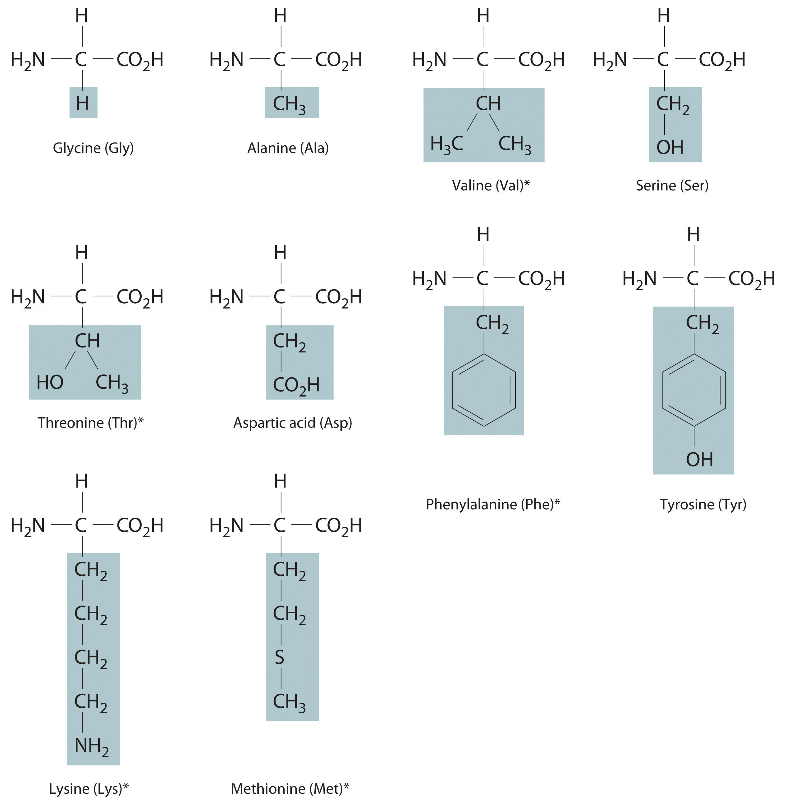 In addition to their amine and carboxylic acid components, amino acids may contain a wide range of other functional groups: R can be hydrogen (–H); an alkyl group (e.g., –CH3); an aryl group (e.g., –CH2C6H5); or a substituted alkyl group that contains an amine, an alcohol, or a carboxylic acid (Figure 5.16 "The Structures of 10 Amino Acids"). Of the 20 naturally occurring amino acids, 10 are required in the human diet; these 10 are called essential amino acids because our bodies are unable to synthesize them from other compounds. Because R can be any of several different groups, each amino acid has a different value of ΔHcomb. Proteins are usually estimated to have an average ΔHcomb of 17 kJ/g (about 4 Cal/g).