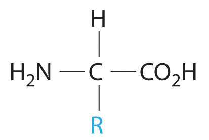General structure of an amino acid. An amino acid contains an amine group (−NH2) and a carboxylic acid group (−CO2H).