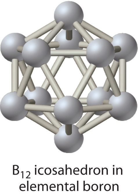 Of the group 13 elements, only the lightest, boron, lies on the diagonal line that separates nonmetals and metals. Thus boron is a semimetal, whereas the rest of the group 13 elements are metals. Elemental boron has an unusual structure consisting of B12 icosahedra covalently bonded to one another; the other elements are typical metallic solids.