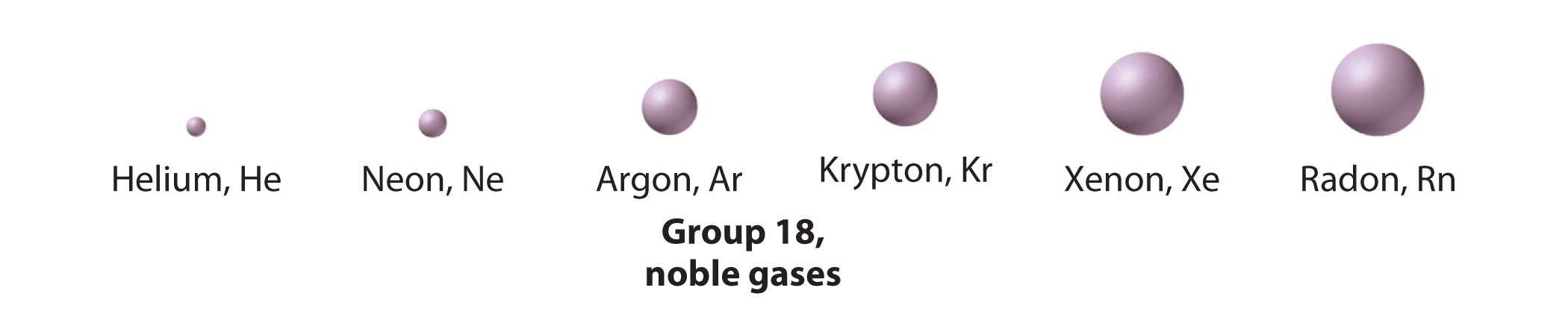 The noble gases are helium, neon, argon, krypton, xenon, and radon. All have filled valence electron configurations and therefore are unreactive elements found in nature as monatomic gases. The noble gases were long referred to as either “rare gases” or “inert gases,” but they are neither rare nor inert. Argon constitutes about 1% of the atmosphere, which also contains small amounts of the lighter group 18 elements, and helium is found in large amounts in many natural gas deposits. The group’s perceived “rarity” stems in part from the fact that the noble gases were the last major family of elements to be discovered.