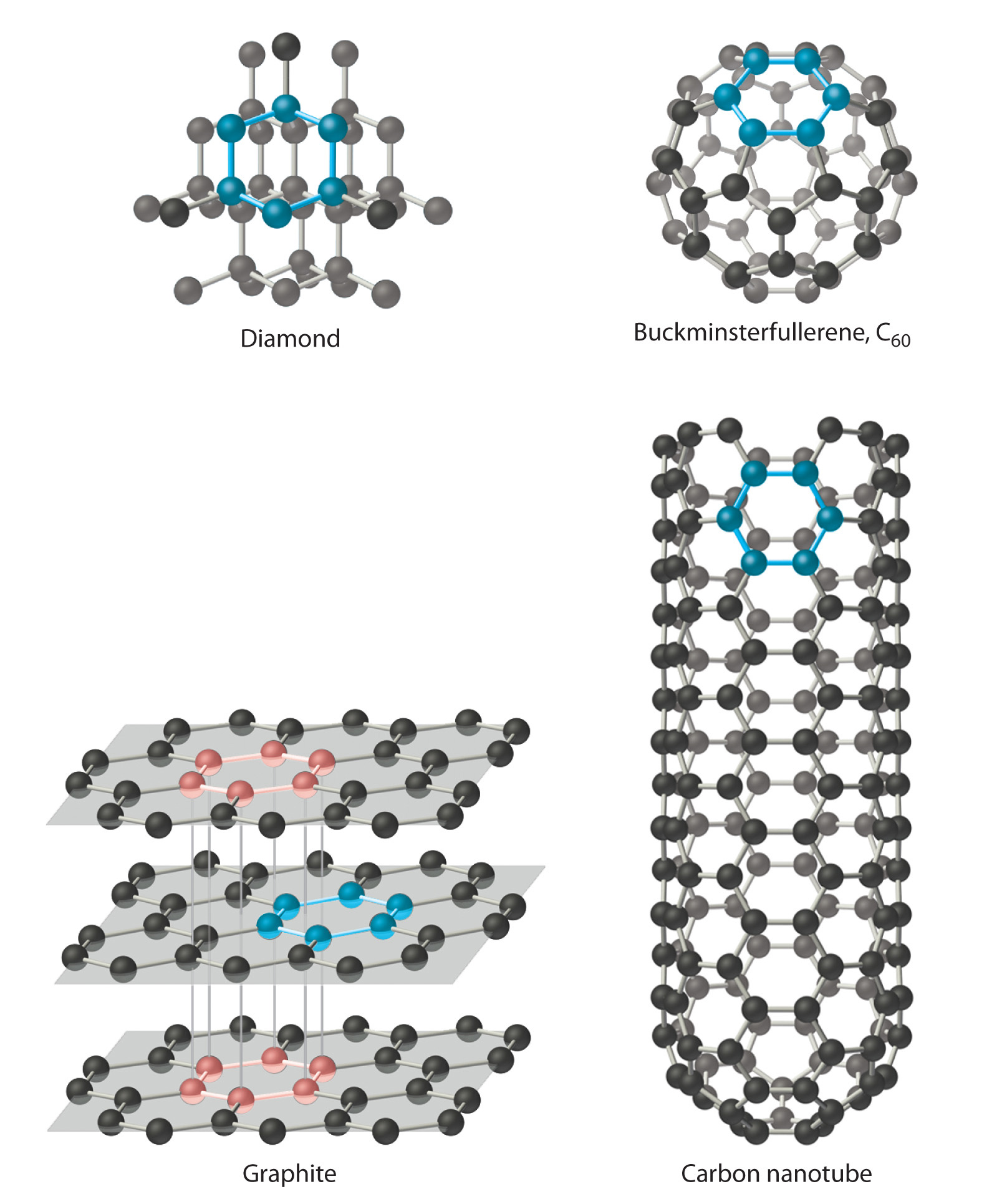 Diamond consists of a rigid three-dimensional array of carbon atoms, making it one of the hardest substances known. In contrast, graphite forms from extended planes of covalently bonded hexagonal rings of carbon atoms that can slide across one another easily. Fullerenes are spherical or ellipsoidal molecules with six- and five-membered rings of carbon atoms, and nanotubes are sheets of graphite rolled up into a cylinder.