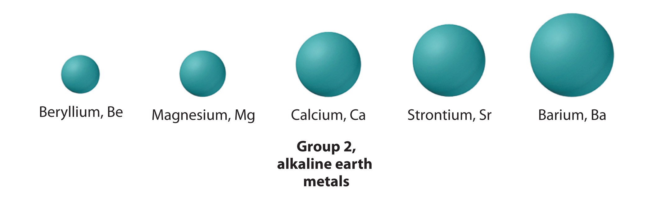 Recall that the trend in most groups is for the lightest member to have properties that are quite different from those of the heavier members. Consistent with this trend, the properties of the lightest element—in this case, beryllium—tend to be different from those of its heavier congeners, the other members of the group. Beryllium is relatively unreactive but forms many covalent compounds, whereas the other group members are much more reactive metals and form ionic compounds. As is the case with the alkali metals, the heaviest element, radium, is highly radioactive, making its size difficult to measure. Radium was discovered in 1902 by Marie Curie (1867–1934; Nobel Prize in Chemistry 1903 and Nobel Prize in Chemistry 1911), who, with her husband, Pierre, isolated 120 mg of radium chloride from tons of residues from uranium mining. (For more information about radioactivity, see Chapter 1 "Introduction to Chemistry", Section 1.5 "The Atom".)