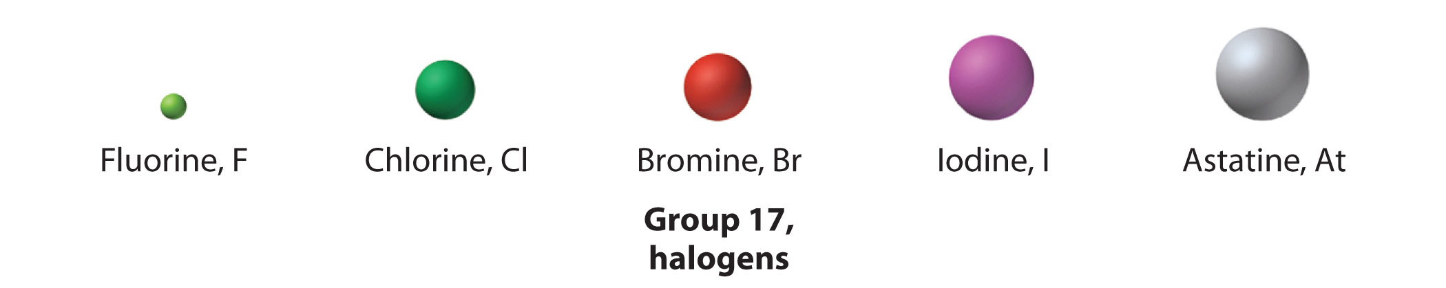 The term halogen, derived from the Greek háls, meaning “salt,” and genes, meaning “producing,” was first applied to chlorine because of its tendency to react with metals to form salts. All of the halogens have an ns2np5 valence electron configuration, and all but astatine are diatomic molecules in which the two halogen atoms share a pair of electrons. Diatomic F2 and Cl2 are pale yellow-green and pale green gases, respectively, while Br2 is a red liquid, and I2 is a purple solid. The halogens were not isolated until the 18th and 19th centuries.