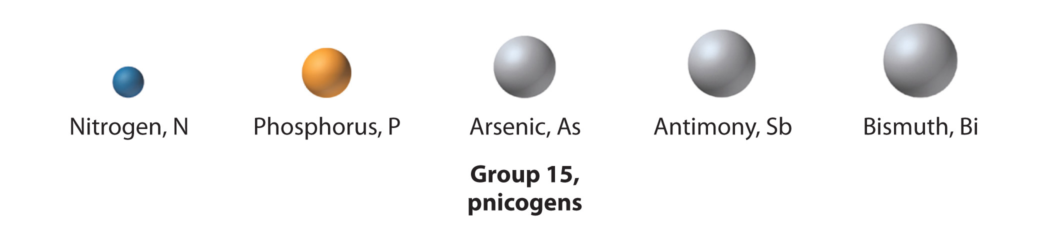 The group 15 elements are called the pnicogensThe elements in group 15 of the periodic table.—from the Greek pnigein, meaning “to choke,” and genes, meaning “producing”—ostensibly because of the noxious fumes that many nitrogen and phosphorus compounds produce. This family has five stable elements; one isotope of bismuth (209Bi) is nonradioactive and is the heaviest nonradioactive isotope of any element. Once again, the lightest member of the family has unique properties. Although both nitrogen and phosphorus are nonmetals, nitrogen under standard conditions is a diatomic gas (N2), whereas phosphorus consists of three allotropes: white, a volatile, low-melting solid consisting of P4 tetrahedra; a red solid comprised of P8, P9, and P10 cages linked by P2 units; and black layers of corrugated phosphorus sheets. The next two elements, arsenic and antimony, are semimetals with extended three-dimensional network structures, and bismuth is a silvery metal with a pink tint.