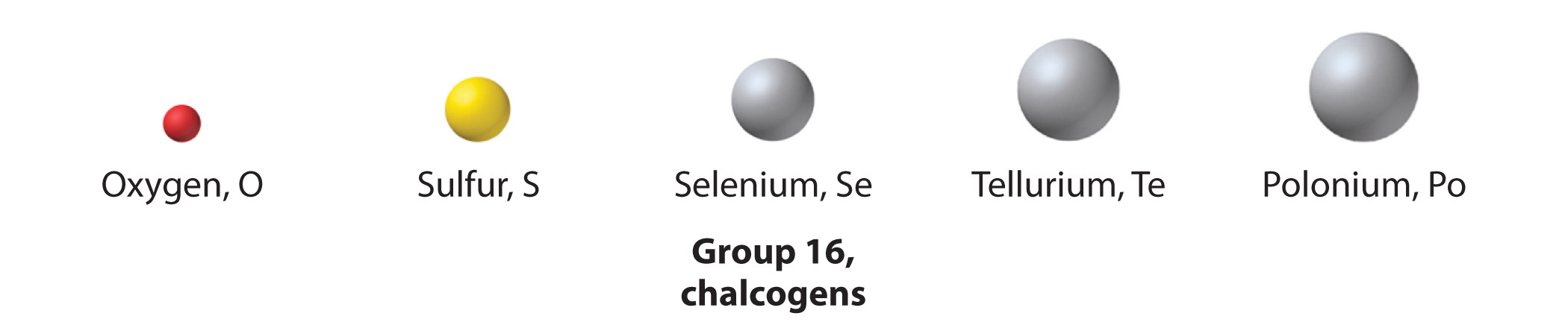 The group 16 elements are often referred to as the chalcogensThe elements in group 16 of the periodic table.—from the Greek chalk, meaning “copper,” and genes, meaning “producing”—because the most ancient copper ore, copper sulfide, is also rich in two other group 16 elements: selenium and tellurium. Once again, the lightest member of the family has unique properties. In its most common pure form, oxygen is a diatomic gas (O2), whereas sulfur is a volatile solid with S8 rings, selenium and tellurium are gray or silver solids that have chains of atoms, and polonium is a silvery metal with a regular array of atoms. Like astatine and radon, polonium is a highly radioactive metallic element.