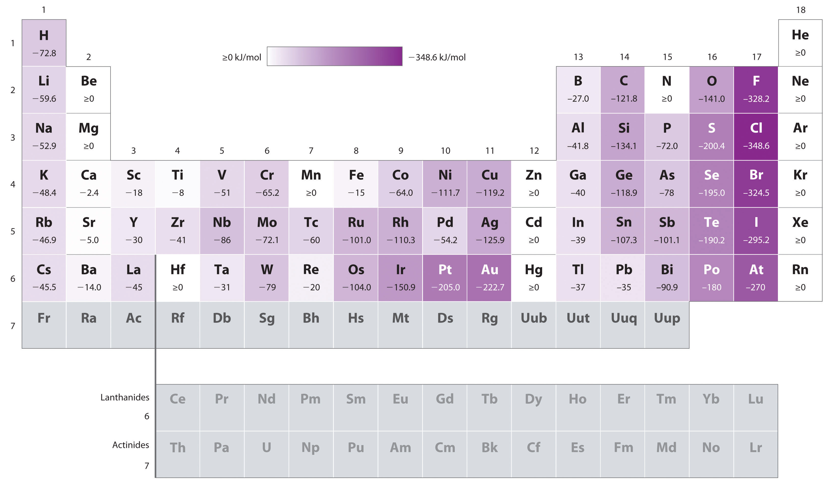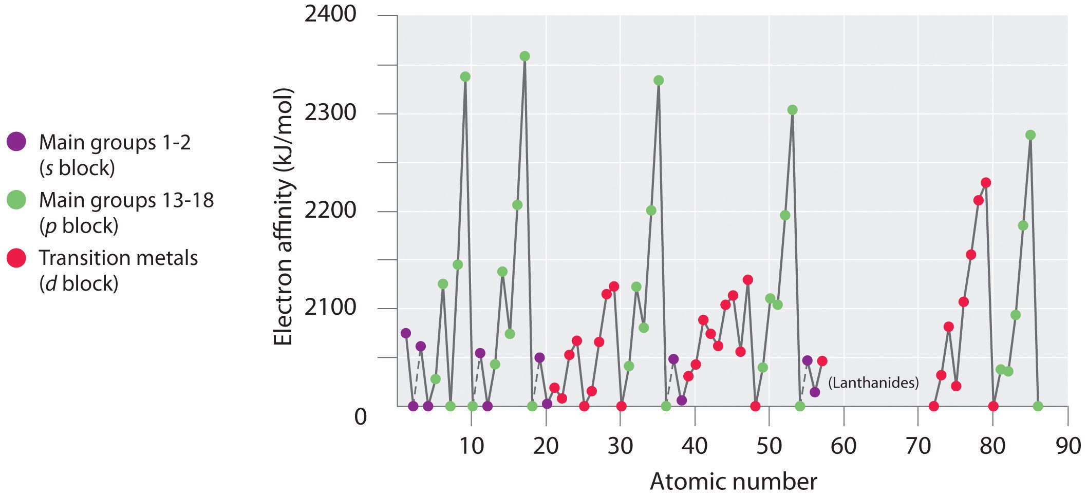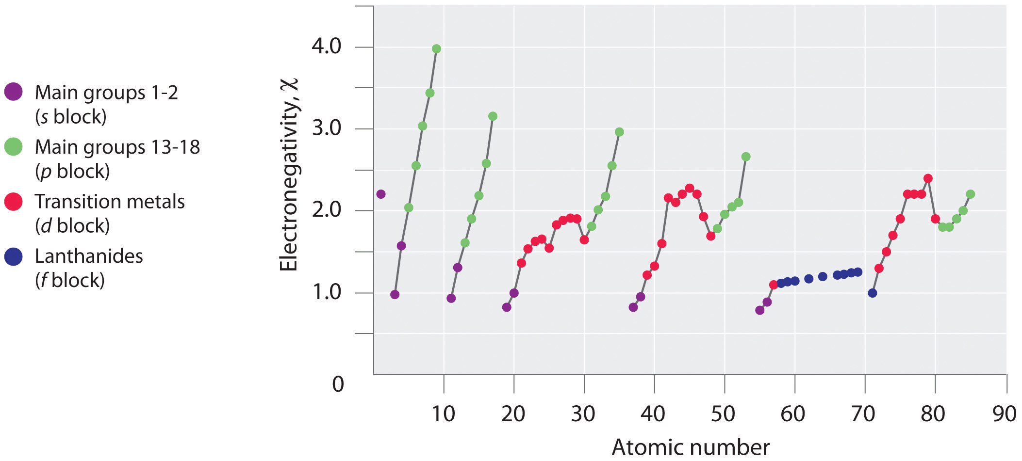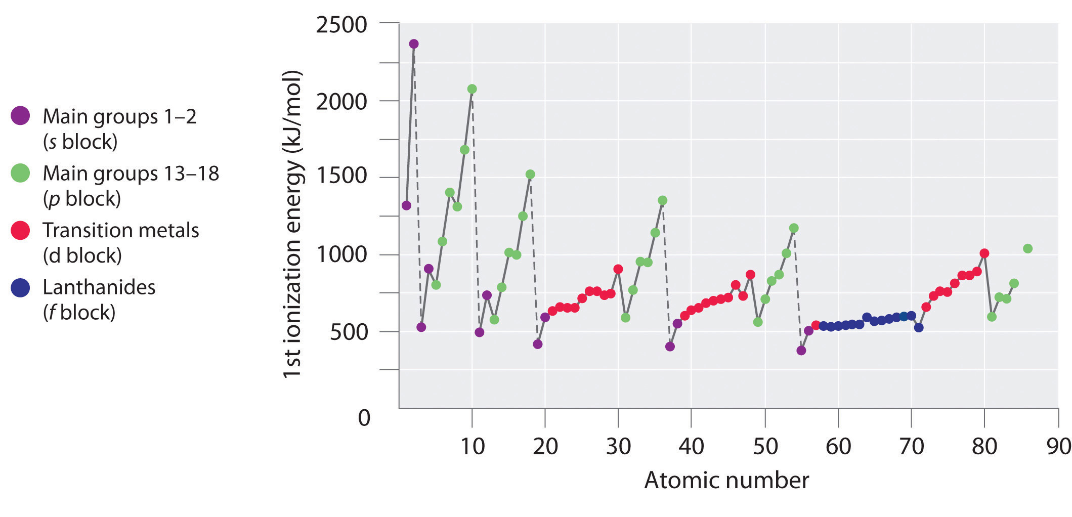 In Chapter 6 "The Structure of Atoms", we presented the contemporary quantum mechanical model of the atom. In using this model to describe the electronic structures of the elements in order of increasing atomic number, we saw that periodic similarities in electron configuration correlate with periodic similarities in properties, which is the basis for the structure of the periodic table. For example, the noble gases have what is often called filled or closed-shell valence electron configurations. These closed shells are actually filled s and p subshells with a total of eight electrons, which are called octets; helium is an exception, with a closed 1s shell that has only two electrons. Because of their filled valence shells, the noble gases are generally unreactive. In contrast, the alkali metals have a single valence electron outside a closed shell and readily lose this electron to elements that require electrons to achieve an octet, such as the halogens. Thus because of their periodic similarities in electron configuration, atoms in the same column of the periodic table tend to form compounds with the same oxidation states and stoichiometries. Chapter 6 "The Structure of Atoms" ended with the observation that, because all the elements in a column have the same valence electron configuration, the periodic table can be used to find the electron configuration of most of the elements at a glance.