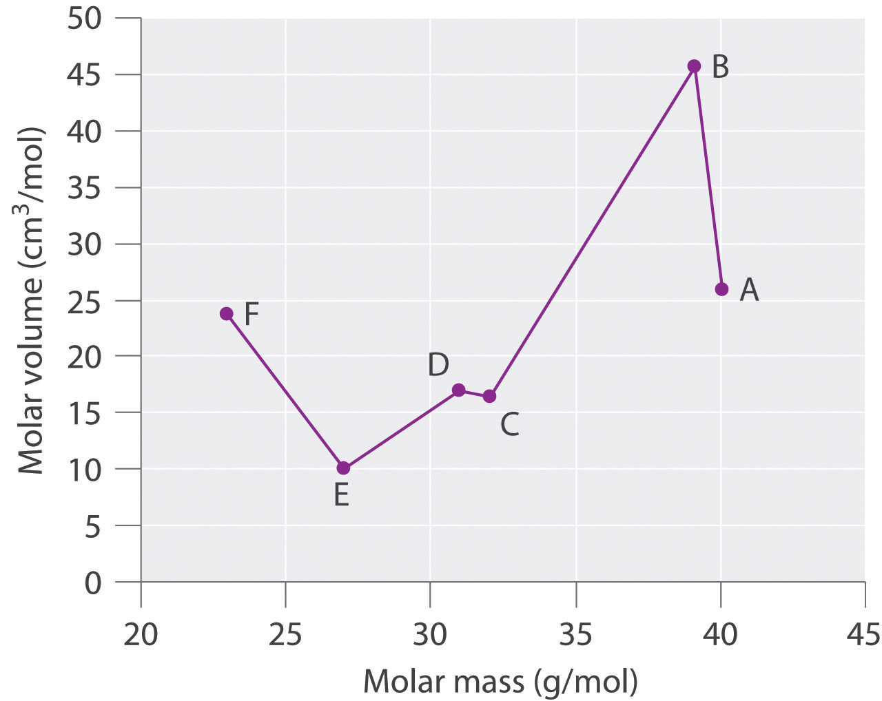 Meyer found that the alkali metals had the highest molar volumes, and that molar volumes decreased steadily with increasing atomic mass, then leveled off, and finally rose again. The elements located on the rising portion of a plot of molar volume versus molar mass were typically nonmetals. If we look at the plot of the data in the table, we can immediately identify those elements with the largest molar volumes (A, B, F) as metals located on the left side of the periodic table. The element with the smallest molar volume (E) is aluminum. The plot shows that the subsequent elements (C, D) have molar volumes that are larger than that of E, but smaller than those of A and B. Thus, C and D are most likely to be nonmetals (which is the case: C = sulfur, D = phosphorus).