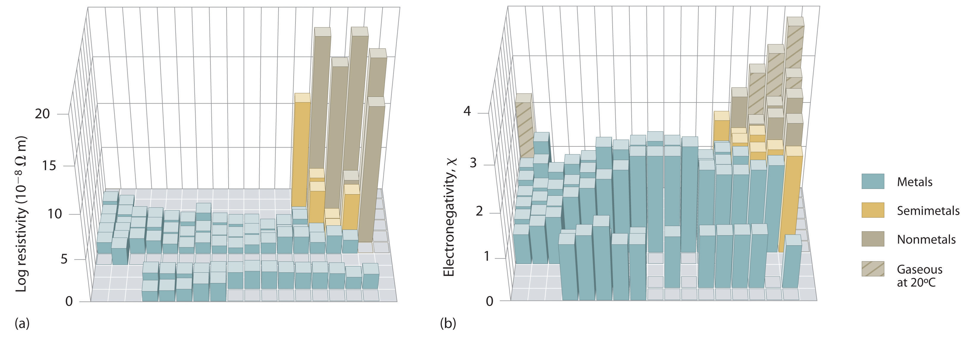 As shown in Figure 7.2 "Variation of Atomic Volume with Atomic Number, Adapted from Meyer’s Plot of 1870", the alkali metals have the highest molar volumes of the solid elements. In Meyer’s plot of atomic volume versus atomic mass, the nonmetals occur on the rising portion of the graph, and metals occur at the peaks, in the valleys, and on the downslopes.