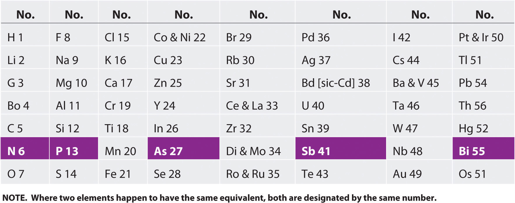 By the mid-19th century, the atomic masses of many of the elements had been determined. The English chemist John Newlands (1838–1898), hypothesizing that the chemistry of the elements might be related to their masses, arranged the known elements in order of increasing atomic mass and discovered that every seventh element had similar properties (Figure 7.1 "The Arrangement of the Elements into Octaves as Proposed by Newlands"). (The noble gases were still unknown.) Newlands therefore suggested that the elements could be classified into octavesA group of seven elements, corresponding to the horizontal rows in the main group elements (not counting the noble gases, which were unknown at the time)., corresponding to the horizontal rows in the main group elements. Unfortunately, Newlands’s “law of octaves” did not seem to work for elements heavier than calcium, and his idea was publicly ridiculed. At one scientific meeting, Newlands was asked why he didn’t arrange the elements in alphabetical order instead of by atomic mass, since that would make just as much sense! Actually, Newlands was on the right track—with only a few exceptions, atomic mass does increase with atomic number, and similar properties occur every time a set of ns2np6 subshells is filled. Despite the fact that Newlands’s table had no logical place for the d-block elements, he was honored for his idea by the Royal Society of London in 1887.
