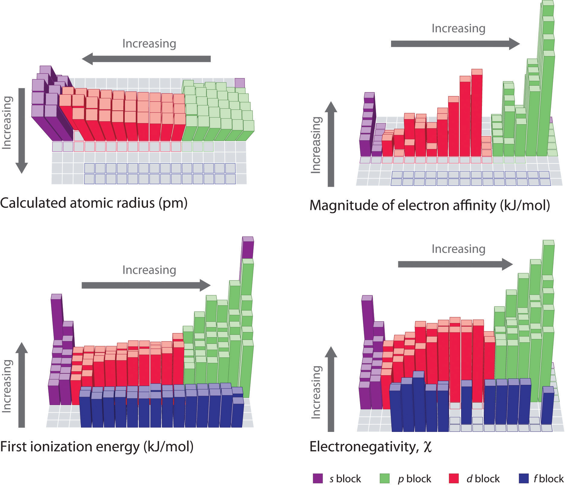 Trends in atomic size result from differences in the effective nuclear charges (Zeff) experienced by electrons in the outermost orbitals of the elements. As we described in Chapter 6 "The Structure of Atoms", for all elements except H, the effective nuclear charge is always less than the actual nuclear charge because of shielding effects. The greater the effective nuclear charge, the more strongly the outermost electrons are attracted to the nucleus and the smaller the atomic radius.