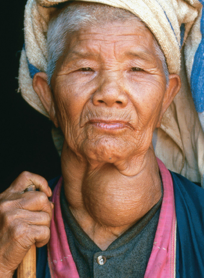 An individual with goiter. In the United States, “iodized salt” prevents the occurrence of goiter.