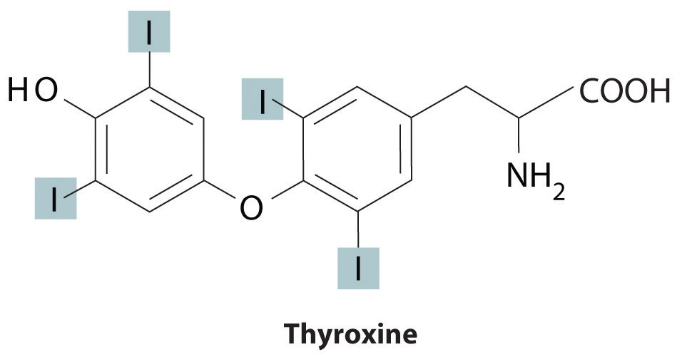Trace elements also act as essential structural components of biological tissues or molecules. In many systems where trace elements do not change oxidation states or otherwise participate directly in biochemical reactions, it is often assumed, though frequently with no direct evidence, that the element stabilizes a particular three-dimensional structure of the biomolecule in which it is found. One example is a sugar-binding protein containing Mn2+ and Ca2+ that is a part of the biological defense system of certain plants. Other examples include enzymes that require Zn2+ at one site for activity to occur at a different site on the molecule. Some nonmetallic elements, such as F−, also appear to have structural roles. Fluoride, for example, displaces the hydroxide ion from hydroxyapatite in bone and teeth to form fluoroapatite [Ca5(PO4)3F]. Fluoroapatite is less soluble in acid and provides increased resistance to tooth decay. Another example of a nonmetal that plays a structural role is iodine, which in humans is found in only one molecule, the thyroid hormone thyroxine. When a person’s diet does not contain sufficient iodine, the thyroid glands in their neck become greatly enlarged, leading to a condition called goiter. Because iodine is found primarily in ocean fish and seaweed, many of the original settlers of the American Midwest developed goiter due to the lack of seafood in their diet. Today most table salt contains small amounts of iodine [actually potassium iodide (KI)] to prevent this problem.