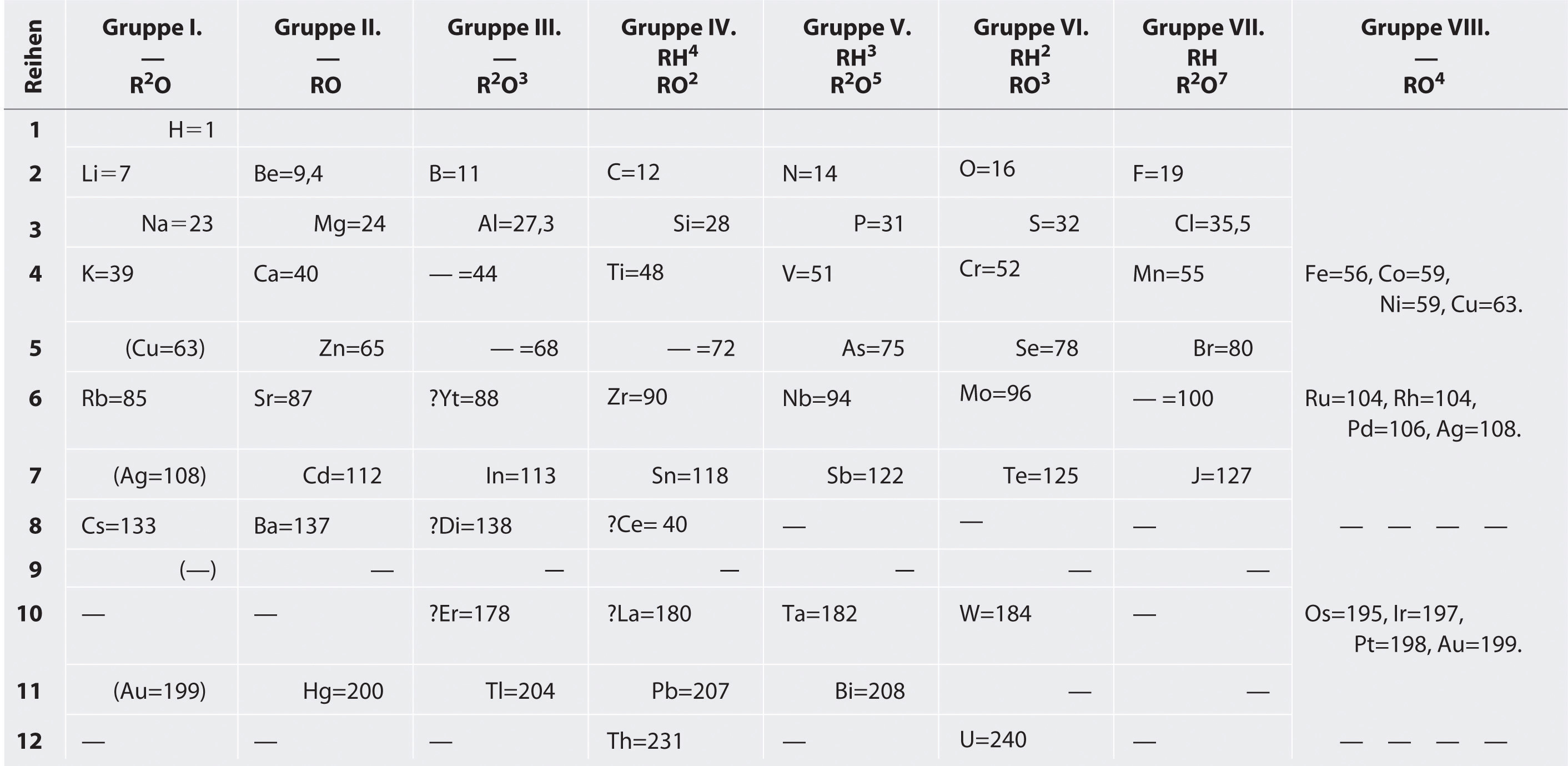 Figure 7.3 Mendeleev’s Periodic Table, as Published in the German Journal Annalen der Chemie und Pharmacie in 1872