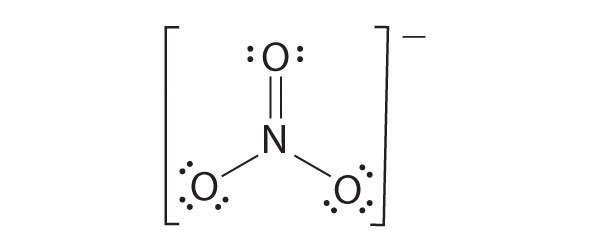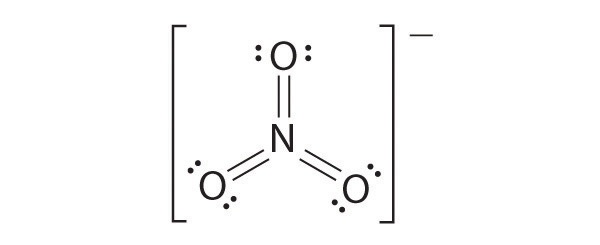 There are three equivalent resonance structures for nitrate (only one is shown), in which nitrogen is doubly bonded to one of the three oxygens. In each resonance structure, the formal charge of N is +1; for each singly bonded O, it is −1; and for the doubly bonded oxygen, it is 0.