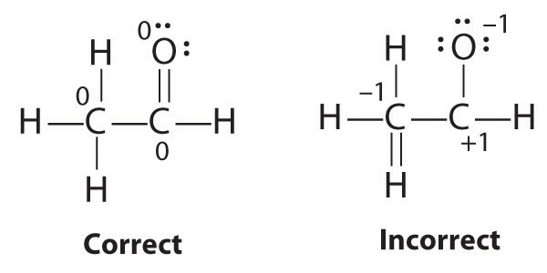 Why is this structure not feasible? Draw an acceptable Lewis structure for acetaldehyde. Show the formal charges of all nonhydrogen atoms in both the correct and incorrect structures.