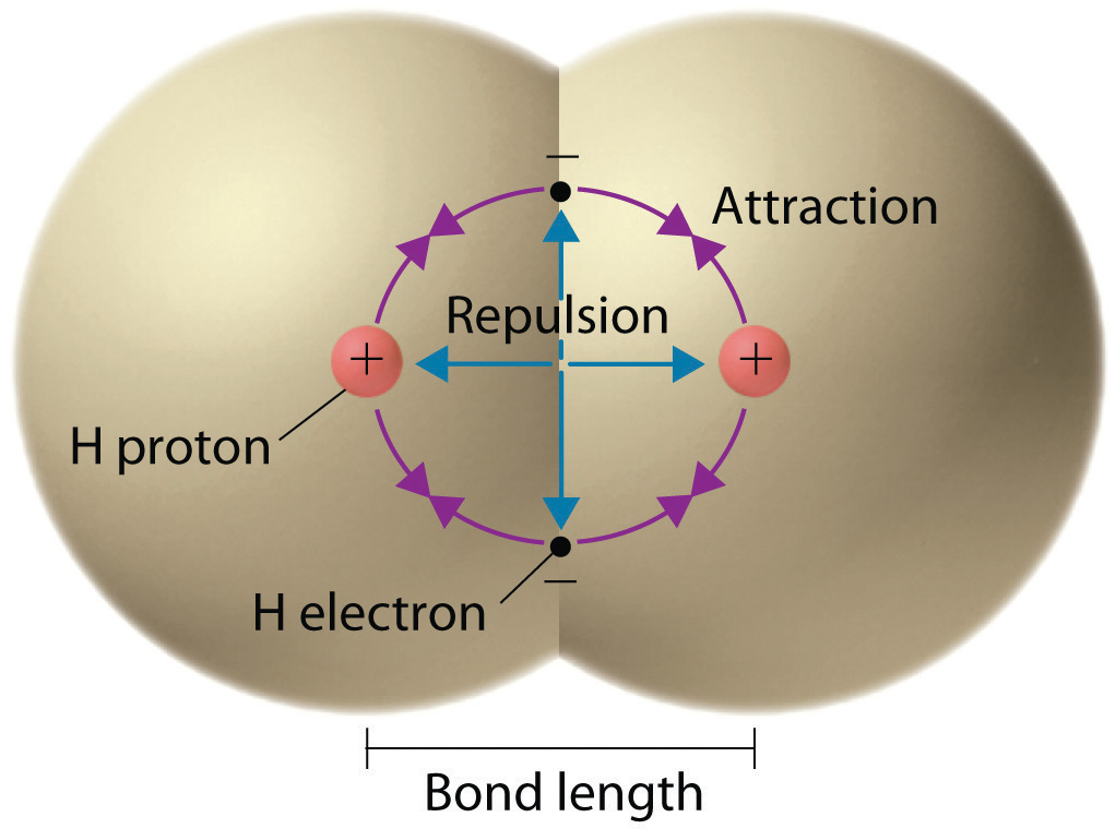 At long distances, both attractive and repulsive interactions are small. As the distance between the atoms decreases, the attractive electron–proton interactions dominate, and the energy of the system decreases. At the observed bond distance, the repulsive electron–electron and proton–proton interactions just balance the attractive interactions, preventing a further decrease in the internuclear distance. At very short internuclear distances, the repulsive interactions dominate, making the system less stable than the isolated atoms.