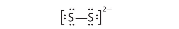 In a diatomic molecule or ion, we do not need to worry about a central atom. Each sulfur atom (group 16) contains 6 valence electrons, and we need to add 2 electrons for the −2 charge, giving a total of 14 valence electrons. Using 2 electrons for the S–S bond, we arrange the remaining 12 electrons as three lone pairs on each sulfur, giving each S atom an octet of electrons: