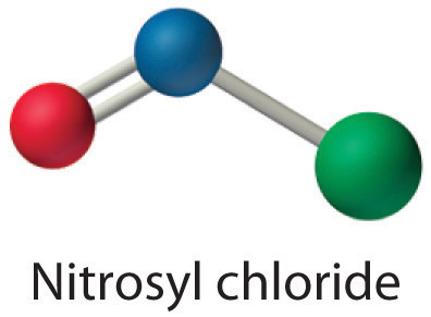 All atoms now have octet configurations. This is the Lewis electron structure of nitrosyl chloride, a highly corrosive, reddish-orange gas.