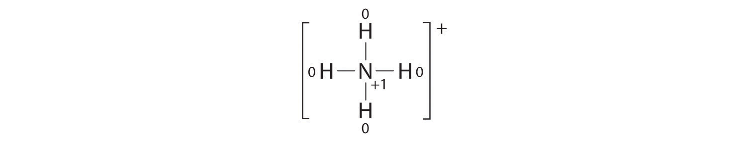A neutral nitrogen atom has five valence electrons (it is in group 15). From its Lewis electron structure, the nitrogen atom in ammonia has one lone pair and shares three bonding pairs with hydrogen atoms, so nitrogen itself is assigned a total of five electrons [2 nonbonding e− + (6 bonding e−/2)]. Substituting into Equation 8.11, we obtain