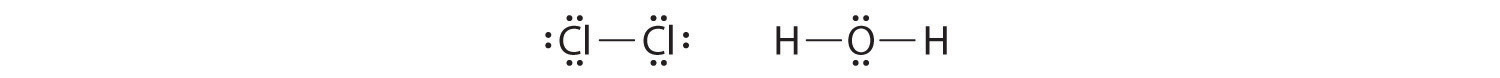 The structure on the right is the Lewis electron structure, or Lewis structure, for H2O. With two bonding pairs and two lone pairs, the oxygen atom has now completed its octet. Moreover, by sharing a bonding pair with oxygen, each hydrogen atom now has a full valence shell of two electrons. Chemists usually indicate a bonding pair by a single line, as shown here for our two examples: