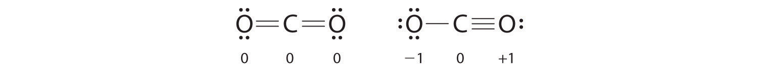 Both Lewis electron structures give all three atoms an octet. How do we decide between these two possibilities? The formal charges for the two Lewis electron structures of CO2 are as follows: