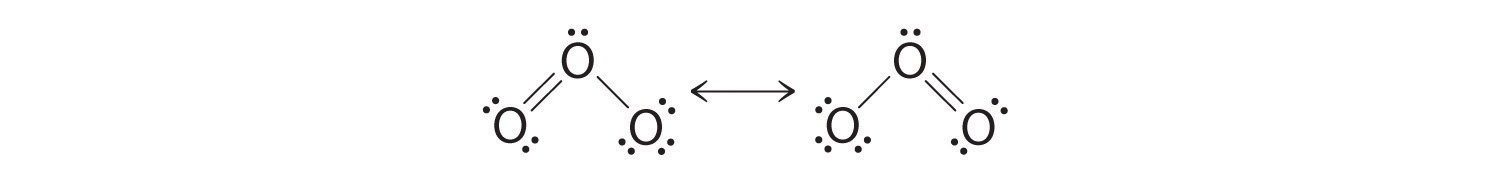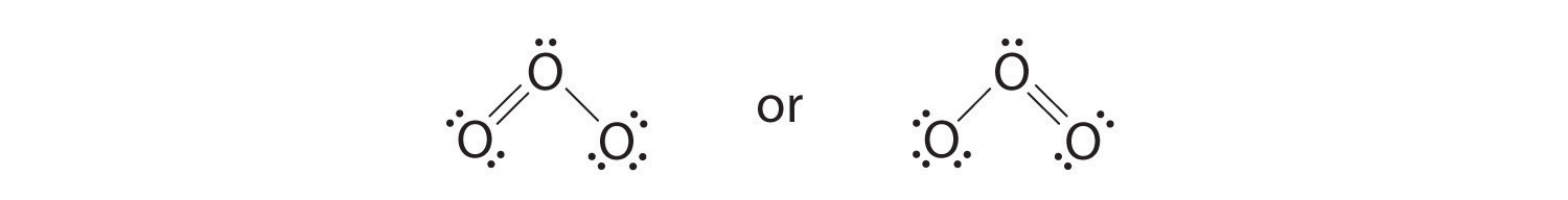 Which is correct? In fact, neither is correct. Both predict one O–O single bond and one O=O double bond. As you will learn in Section 8.8 "Properties of Covalent Bonds", if the bonds were of different types (one single and one double, for example), they would have different lengths. It turns out, however, that both O–O bond distances are identical, 127.2 pm, which is shorter than a typical O–O single bond (148 pm) and longer than the O=O double bond in O2 (120.7 pm).