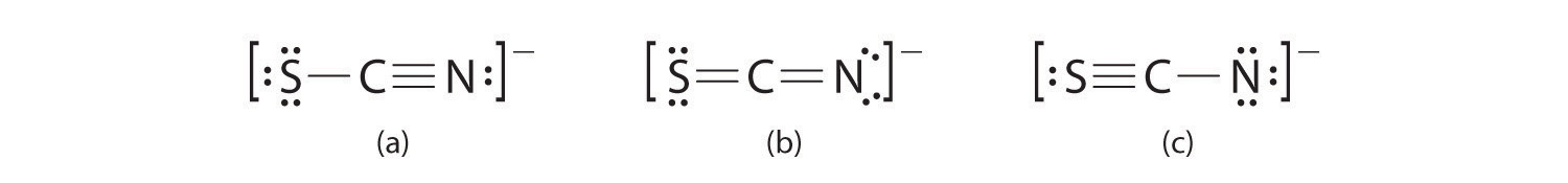 The thiocyanate ion (SCN−), which is used in printing and as a corrosion inhibitor against acidic gases, has at least two possible Lewis electron structures. Draw two possible structures, assign formal charges on all atoms in both, and decide which is the preferred arrangement of electrons.
