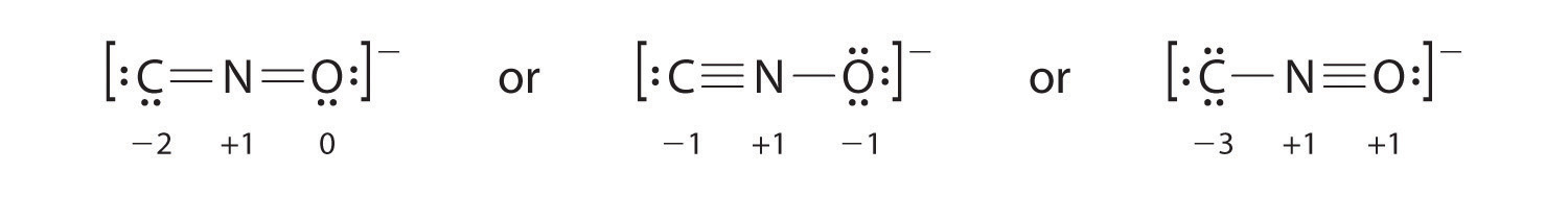 Salts containing the fulminate ion (CNO−) are used in explosive detonators. Draw three Lewis electron structures for CNO− and use formal charges to predict which is more stable. (Note: N is the central atom.)