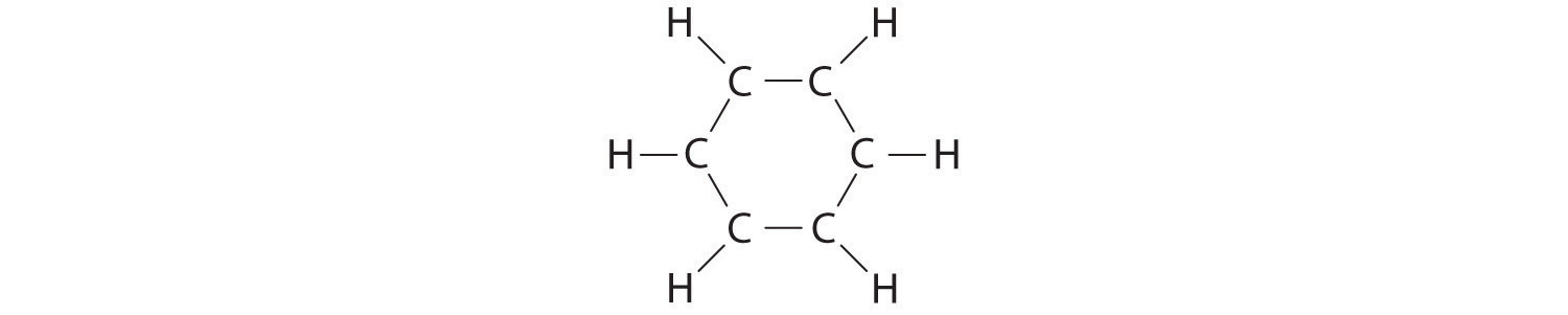 Benzene is a common organic solvent that was previously used in gasoline; it is no longer used for this purpose, however, because it is now known to be a carcinogen. The benzene molecule (C6H6) consists of a regular hexagon of carbon atoms, each of which is also bonded to a hydrogen atom. Use resonance structures to describe the bonding in benzene.