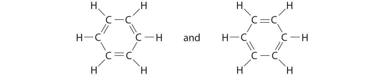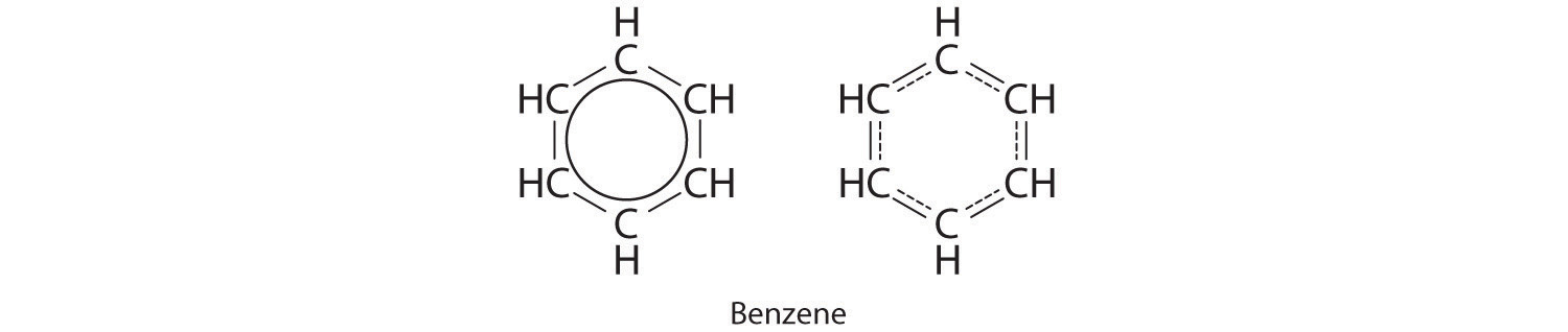 Each structure has alternating double and single bonds, but experimentation shows that each carbon–carbon bond in benzene is identical, with bond lengths (139.9 pm) intermediate between those typically found for a C–C single bond (154 pm) and a C=C double bond (134 pm). We can describe the bonding in benzene using the two resonance structures, but the actual electronic structure is an average of the two. The existence of multiple resonance structures for aromatic hydrocarbons like benzene is often indicated by drawing either a circle or dashed lines inside the hexagon: