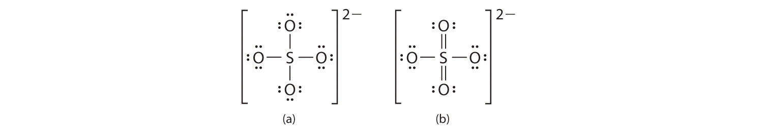 An expanded valence shell is often written for oxoanions of the heavier p-block elements, such as sulfate (SO42−) and phosphate (PO43−). Sulfate, for example, has a total of 32 valence electrons [6 + (4 × 6) + 2]. If we use a single pair of electrons to connect the sulfur and each oxygen, we obtain the four-coordinate Lewis structure (a). We know that sulfur can accommodate more than eight electrons by using its empty valence d orbitals, just as in SF6. An alternative structure (b) can be written with S=O double bonds, making the sulfur again six-coordinate. We can draw five other resonance structures equivalent to (b) that vary only in the arrangement of the single and double bonds. In fact, experimental data show that the S-to-O bonds in the SO42− ion are intermediate in length between single and double bonds, as expected for a system whose resonance structures all contain two S–O single bonds and two S=O double bonds. When calculating the formal charges on structures (a) and (b), we see that the S atom in (a) has a formal charge of +2, whereas the S atom in (b) has a formal charge of 0. Thus by using an expanded octet, a +2 formal charge on S can be eliminated.
