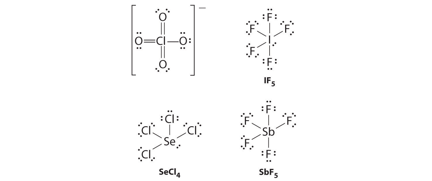 Draw Lewis electron structures for ClO4−, IF5, SeCl4, and SbF5.