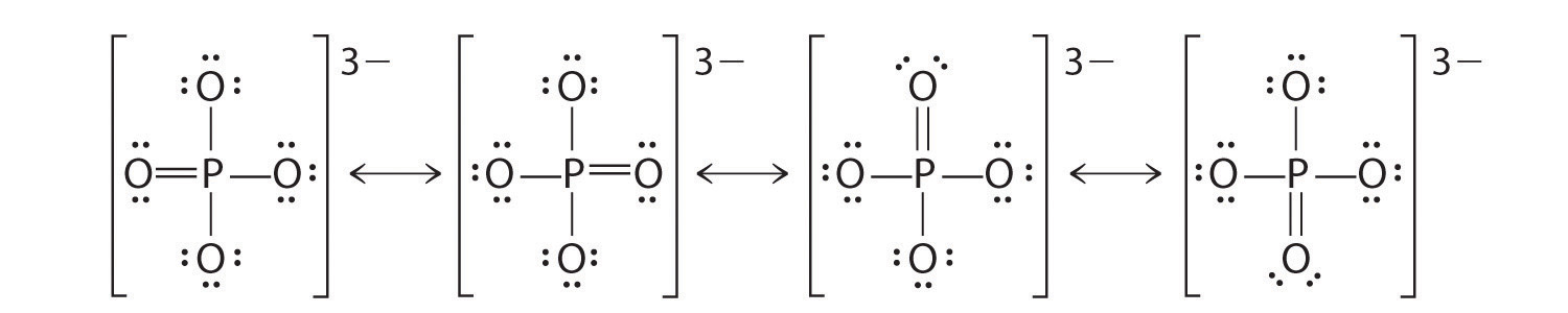 Draw plausible Lewis structures for the phosphate ion, including resonance structures. What is the formal charge on each atom in your structures?