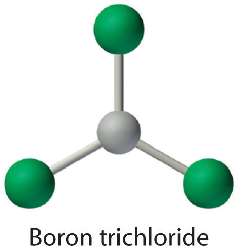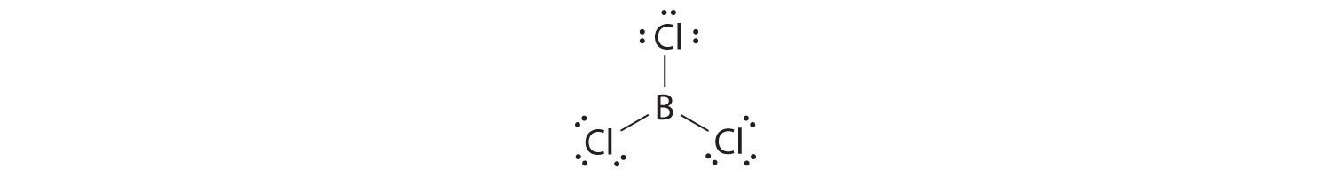 Molecules with atoms that possess less than an octet of electrons generally contain the lighter s- and p-block elements, especially beryllium, typically with just four electrons around the central atom, and boron, typically with six. One example, boron trichloride (BCl3) is used to produce fibers for reinforcing high-tech tennis rackets and golf clubs. The compound has 24 valence electrons and the following Lewis structure: