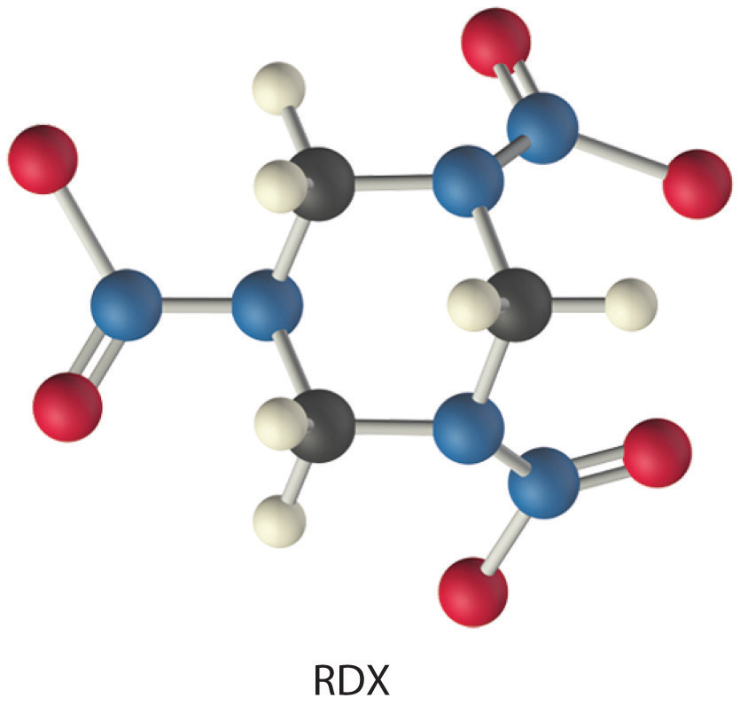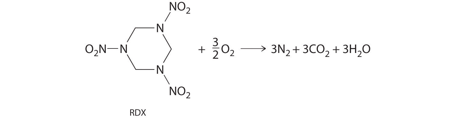 The compound RDX (Research Development Explosive) is a more powerful explosive than dynamite and is used by the military. When detonated, it produces gaseous products and heat according to the following reaction. Use the approximate bond energies in Table 8.6 "Average Bond Energies (kJ/mol) for Commonly Encountered Bonds at 273 K" to estimate the ΔHrxn per mole of RDX.